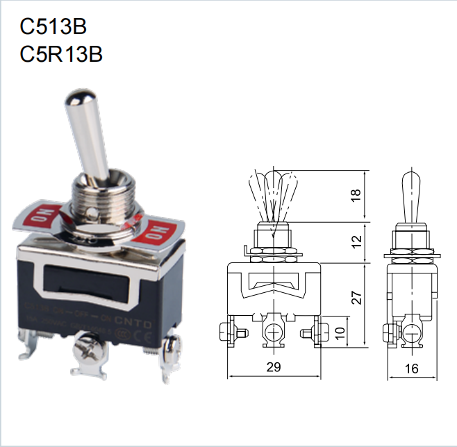CNTD INTERRUPTOR COLA DE RATA 1P + 2T, ON-OFF-ON, INESTABLE 250V 15A Modelo: C5R13B