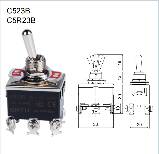 CNTD INTERRUPTOR COLA DE RATA 2P + 2T ON-OFF-ON ESTABLE 250V 15A Modelo: C523B
